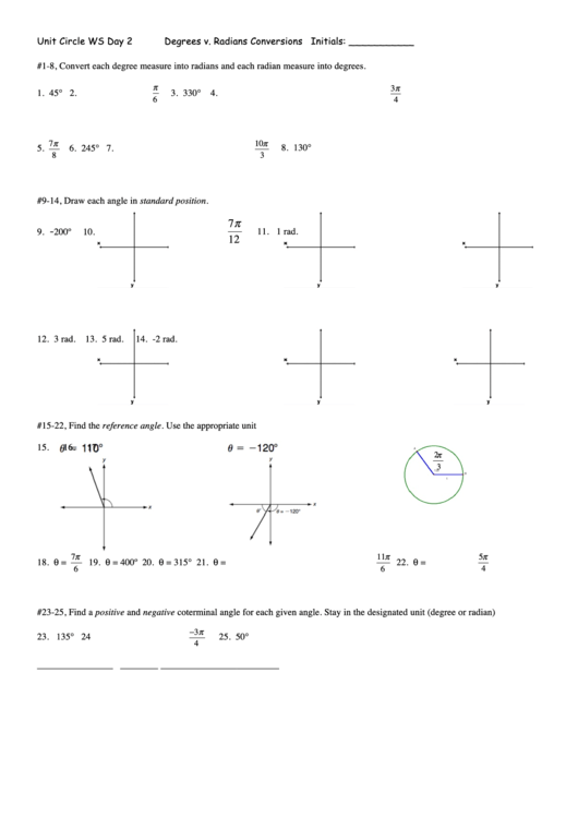 5.1 and 5.2 supplementary worksheet. Worksheet by kuta software llc. Which quadrant the terminal side lies in, the reference angle, and a positive . Find a coterminal angle between 0 and 2π for each given angle. Honors and vt only:find a positive and a negative coterminal angle for each .